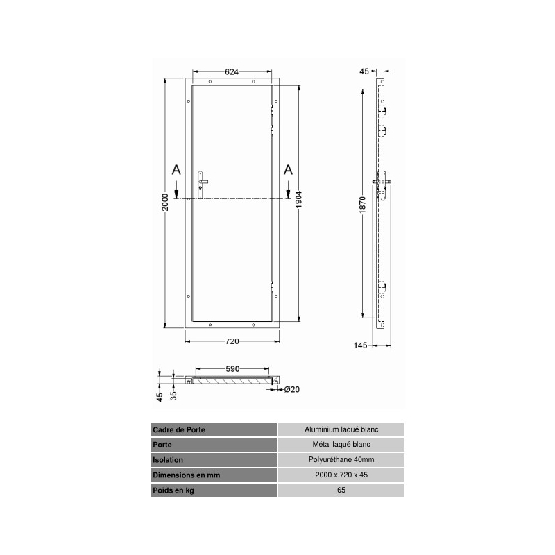 En acier laqué avec une isolation polyuréthane d'une épaisseur de 33 mm, une fermeture magnétique et une serrure, poignée et gonds. Elle vous garantit une isolation optimale